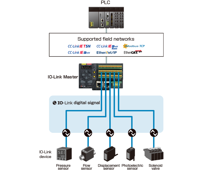 By converting digital, analog devices, and serial device to IO-Link, no communication program is required and input devices can be combined into an IO-Link Master.