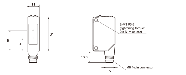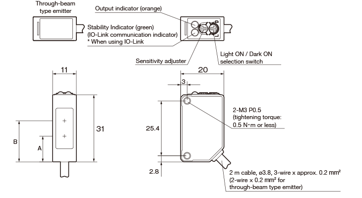 Detection method A: Emitter optical axis B: Receiver optical axis Through-beam - 19 (Emitter & Receiver) Retro-reflective 11.9 19 Diffuse-reflective Limited diffuse-reflective 18.8 Wide-angle diffuse-reflective