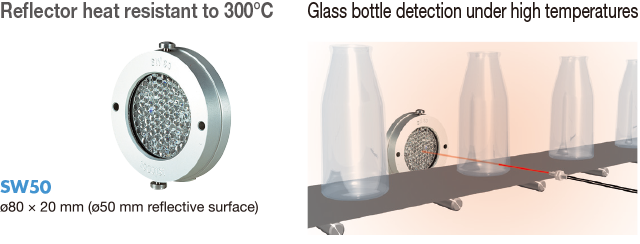Possible to detect as retro-reflective type if the SW50 heat resistant reflector is used for the heat resistant diffuse type Fiber-Optic Cables.