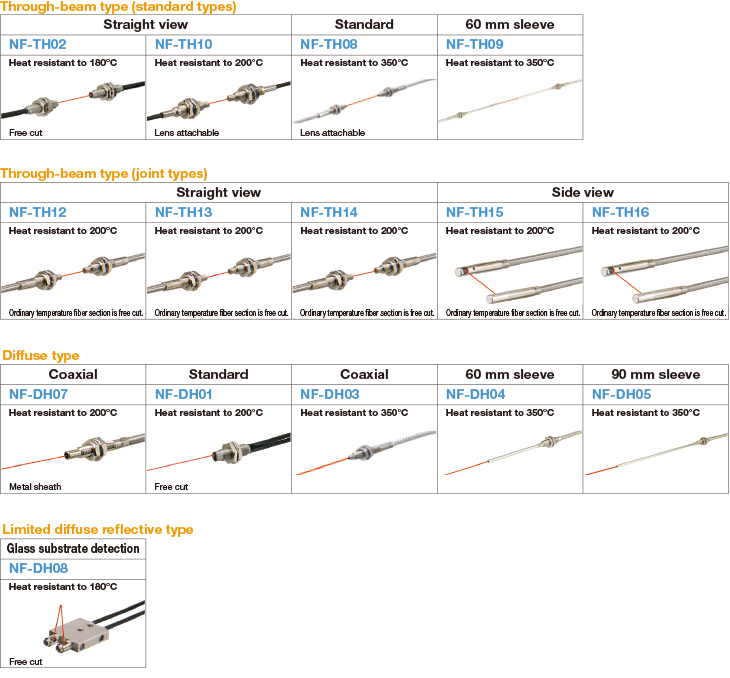 The lineup of heat-resistant Fiber-Optic Cables also includes diffuse types usable in a variety of situations, and limited diffuse reflective types for glass substrate detection.