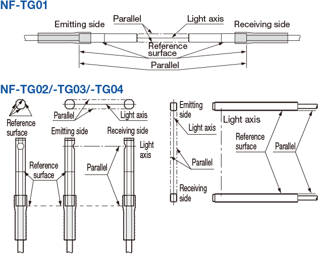 ・When installing, determine a reference surface as shown in the diagram below while paying sufficient attention in regards to light axis shifting and slanting. Install so that emitting/receiving fibers are parallel.