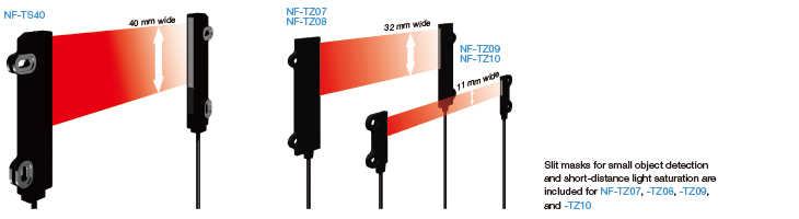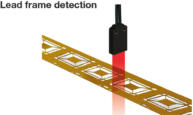 The NF-DZ01 diffuse type enables a detection area with a spot size of 2 × 15 mm (at a distance of 15 mm). Optimal for the detection of workpieces with complex shapes and drilled workpieces such as lead frames.